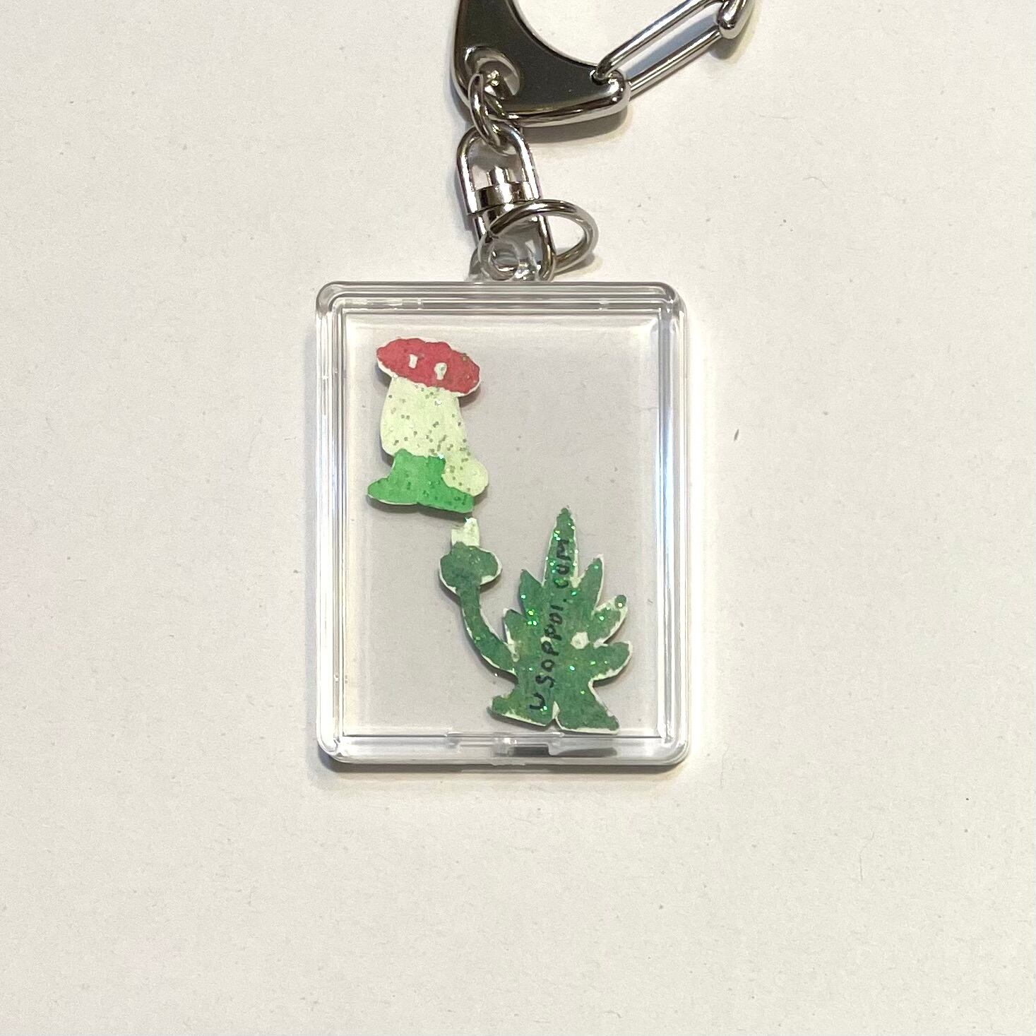 手描きでくり抜かれたじゃんけん中のハッピースくんとキノコ帽のキーホルダー。裏は懐かしラメ。