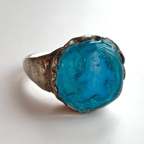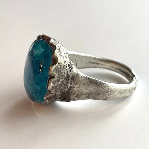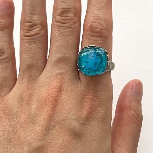 純度99.9%以上の銀粘土を使ったシルバーリングです。 ブルーの部分はUVレジンです。ニッケルメッキでアンティーク風に仕上げています。