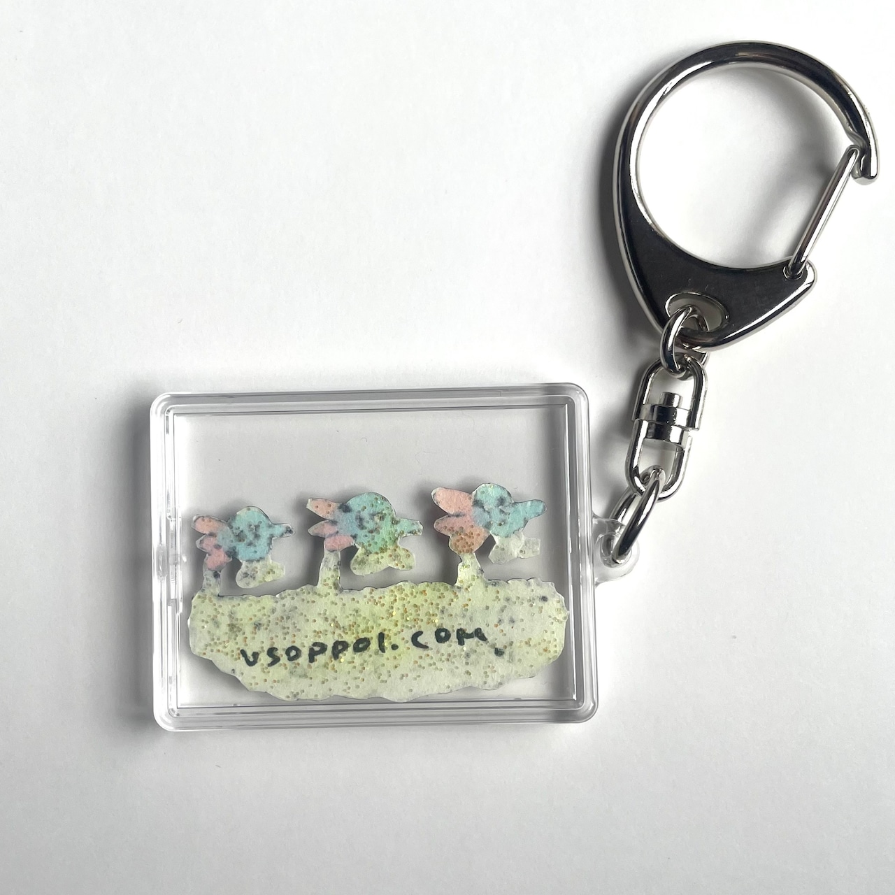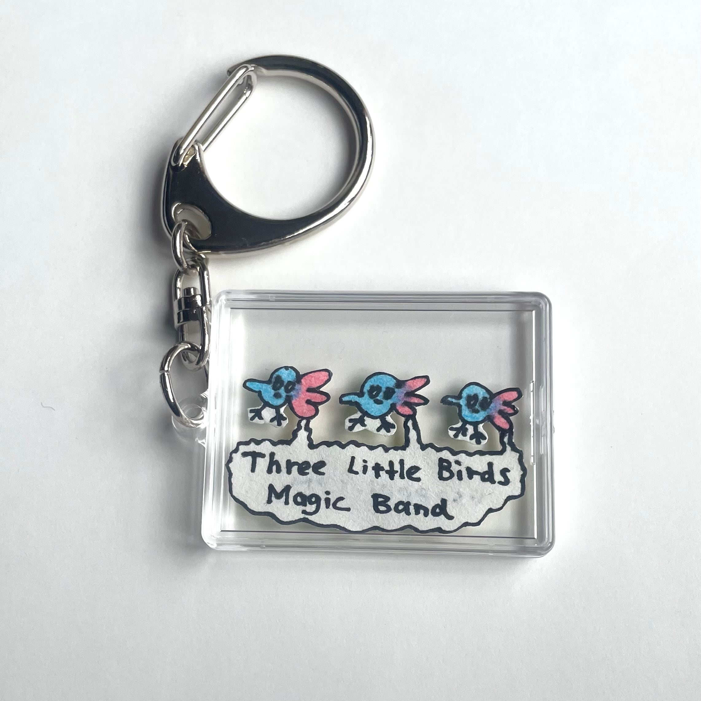 手描きでくり抜かれたThree Little Birds Magic Band のキーホルダー。裏は懐かしラメ。