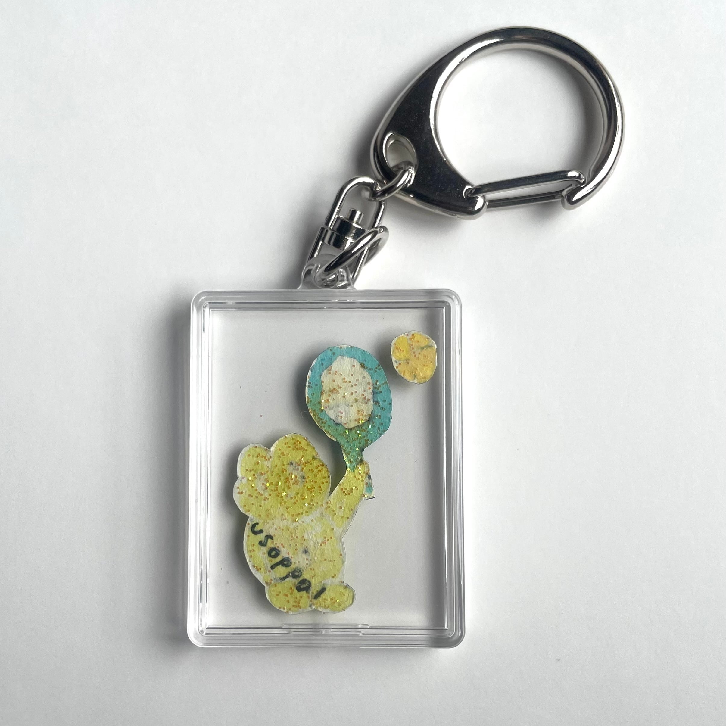 手描きでくり抜かれたテニスのサーブをしているカエルッチのキーホルダー。裏は懐かしラメ。