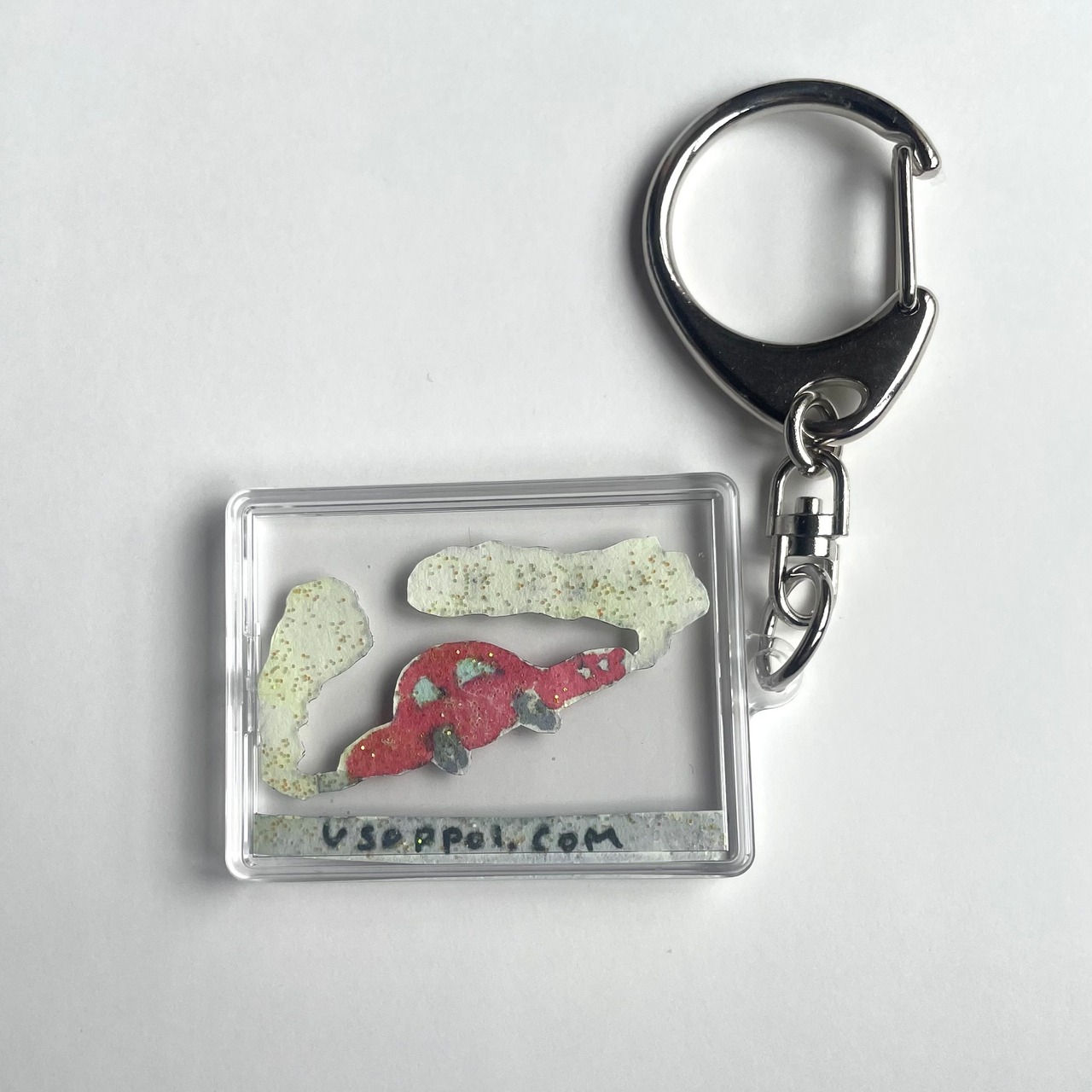 手描きでくり抜かれた少し浮いているミスター・カーのキーホルダー。裏は懐かしラメ。