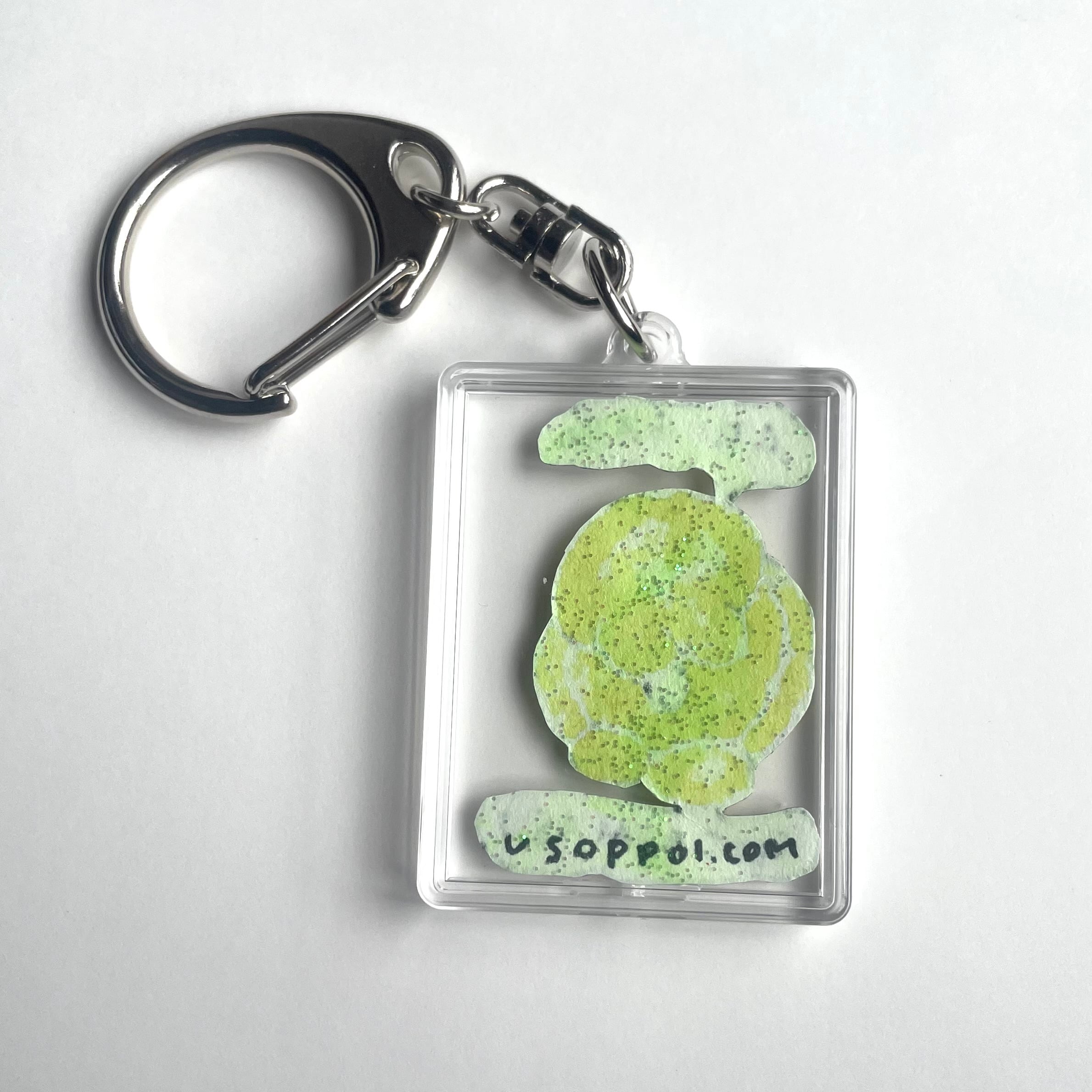 手描きでくり抜かれた深々と頭を下げるカエルッチのキーホルダー。裏は懐かしラメ。