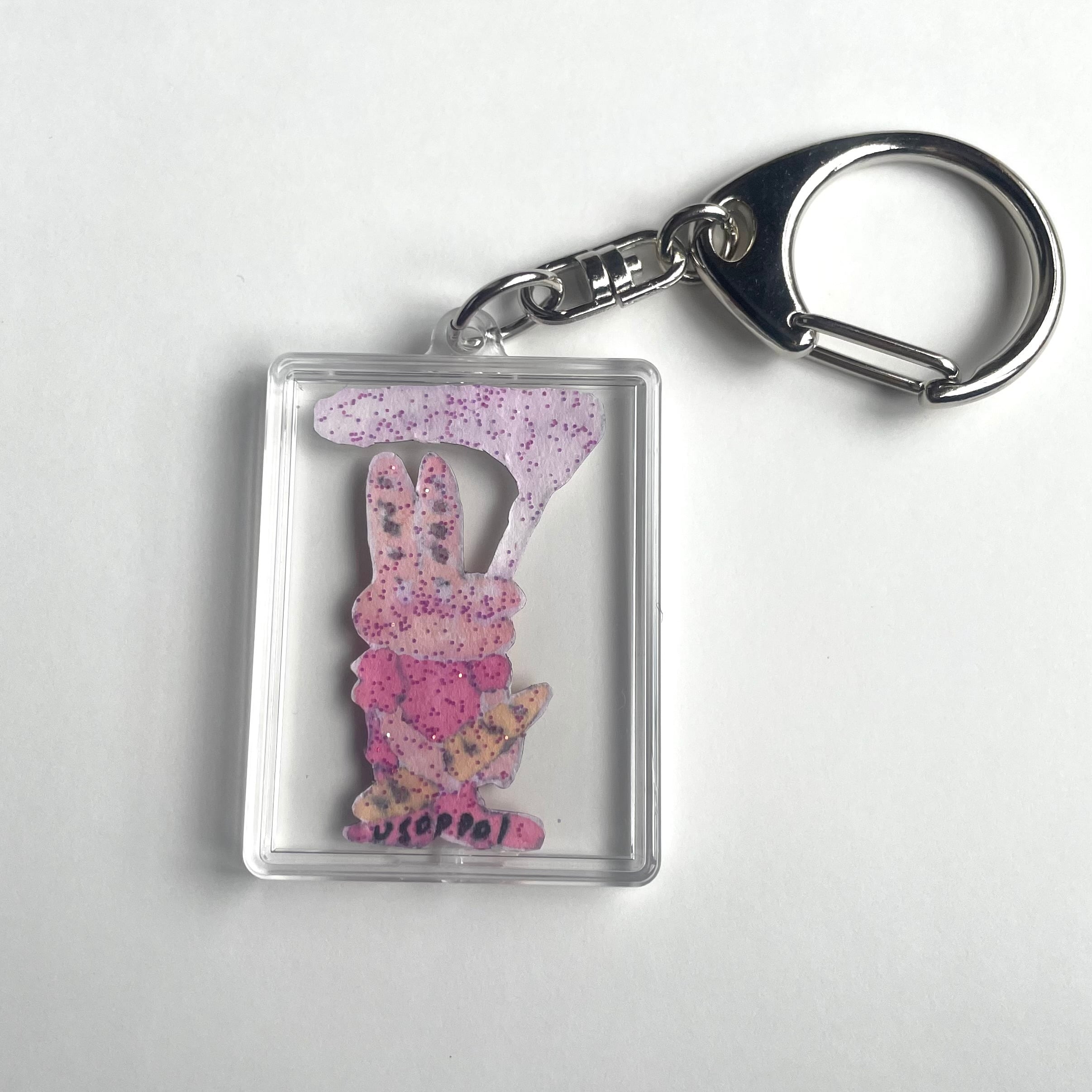 手描きでくり抜かれたウララとつぶやくミセス・バゲットのキーホルダー。裏は懐かしラメ。