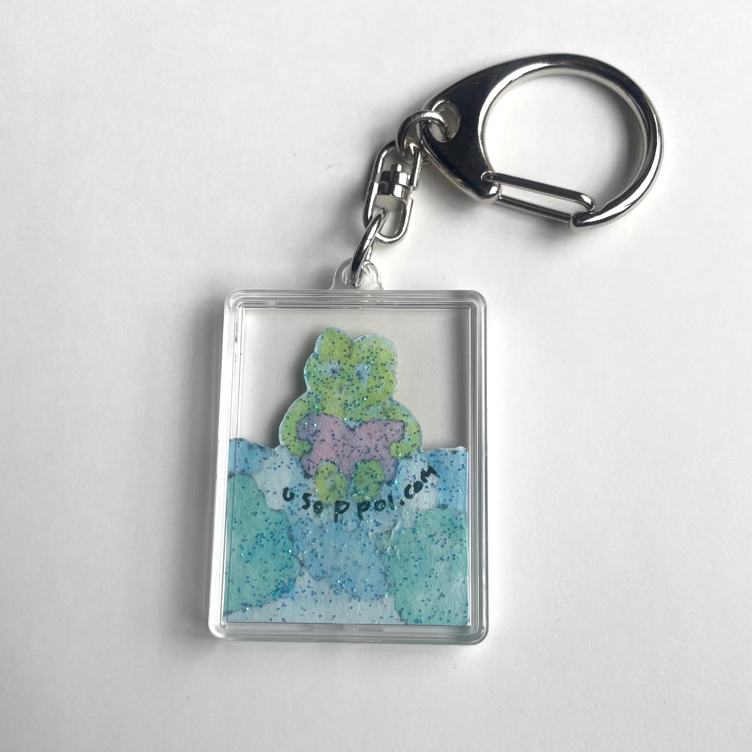 透明手描キーホルダー: 雲の上で読書中のカエルッチ
